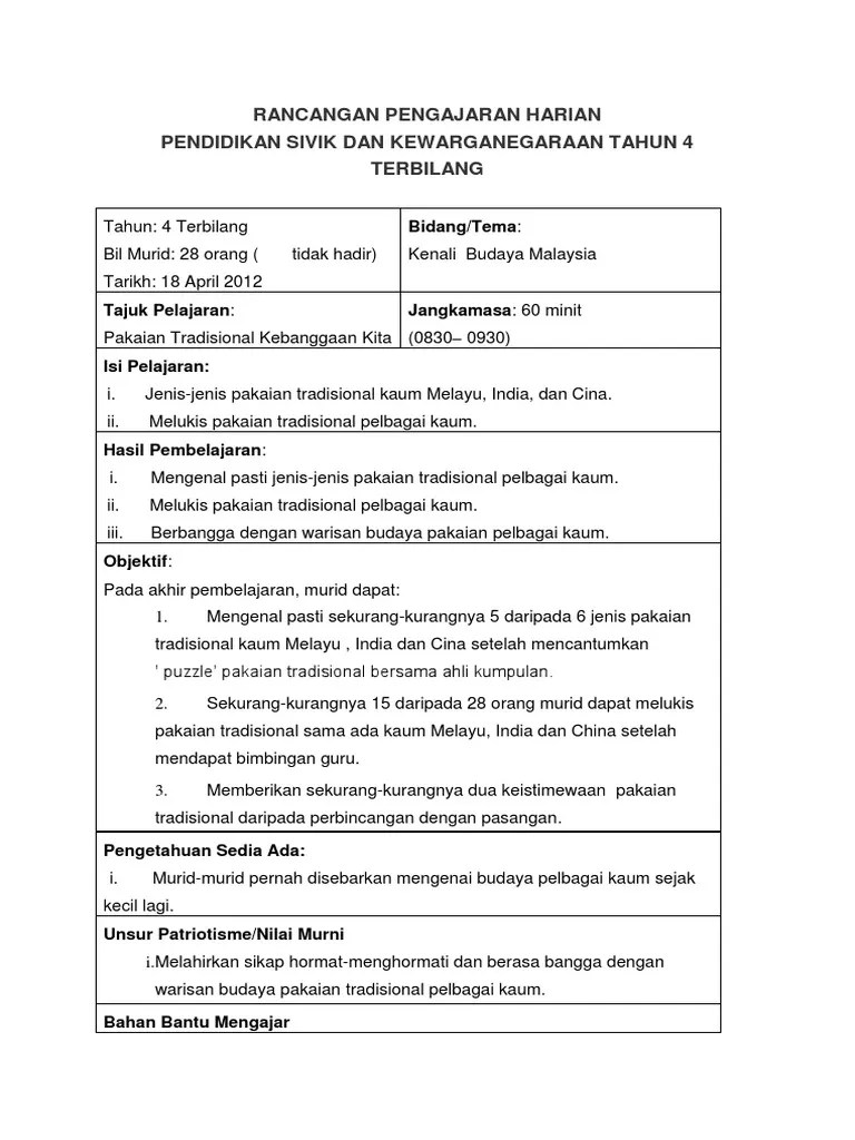 Contoh rph dan latihan bertajuk pakaian tradisional masyarakat malaysia.